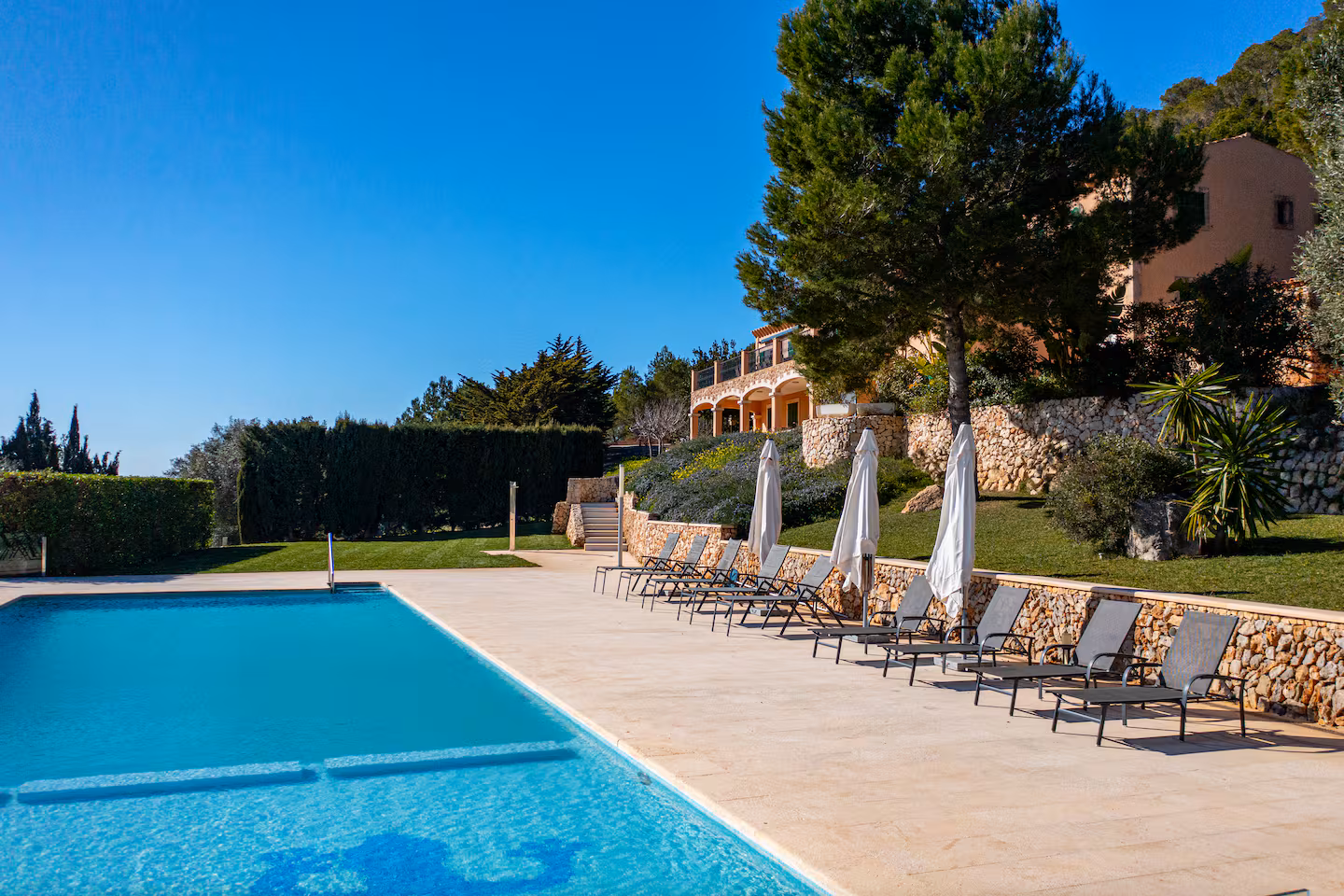 Det stora och rymliga huset är omgivet av olivlundar och fruktträdgårdar och ligger med utsikt över dalgång och berg. Från infinitypoolen ser du ut över ett landskap som andas stillhet och autenticitet. Här finns både gott om utrymme för kravlöst umgänge liksom möjlighet att dra sig undan och få egentid.